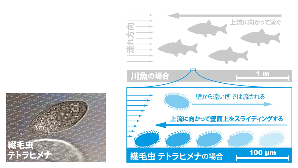 単細胞の繊毛虫テトラヒメナが水中の構造物付近で走流性を示す機構を明らかにしました。流れ場でのテトラヒメナの動きを顕微鏡観...