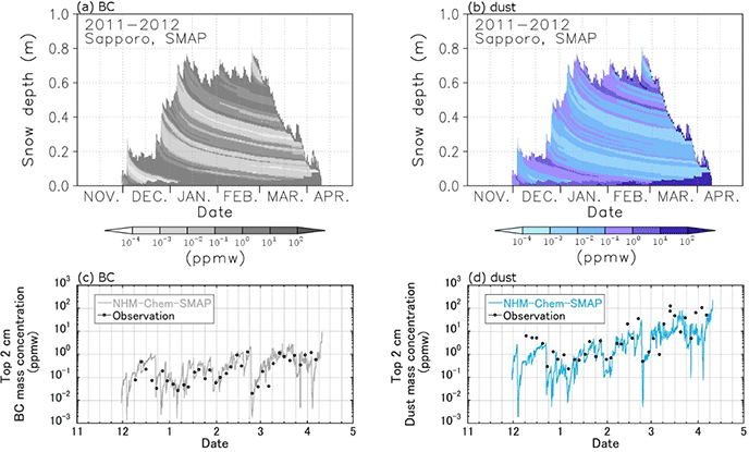 雪面が吸収する太陽光を増加させ、融雪を加速する可能性があります。積雪変質モデルと領域気象化学モデルを組み合わせて、201...