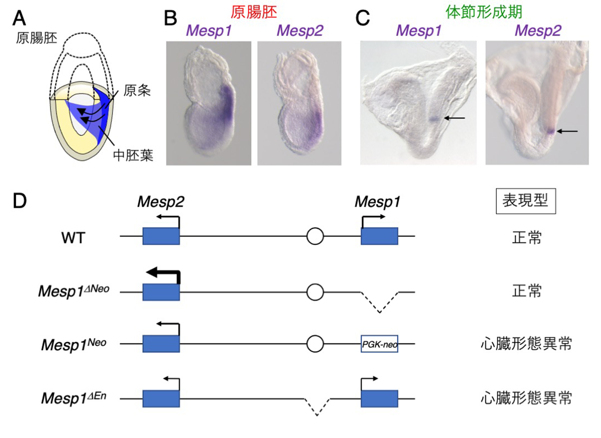 CRISPR/Cas9ゲノム編集技術を用いMesp1/2遺伝子変異マウスを作製・解析したところ、中胚葉細胞においてMES...