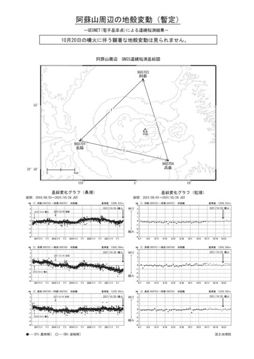 10月20日11時43分に発生した阿蘇山の中岳第一火口での噴火に伴う顕著な地殻変動は、検出されていません。令和3年(20...