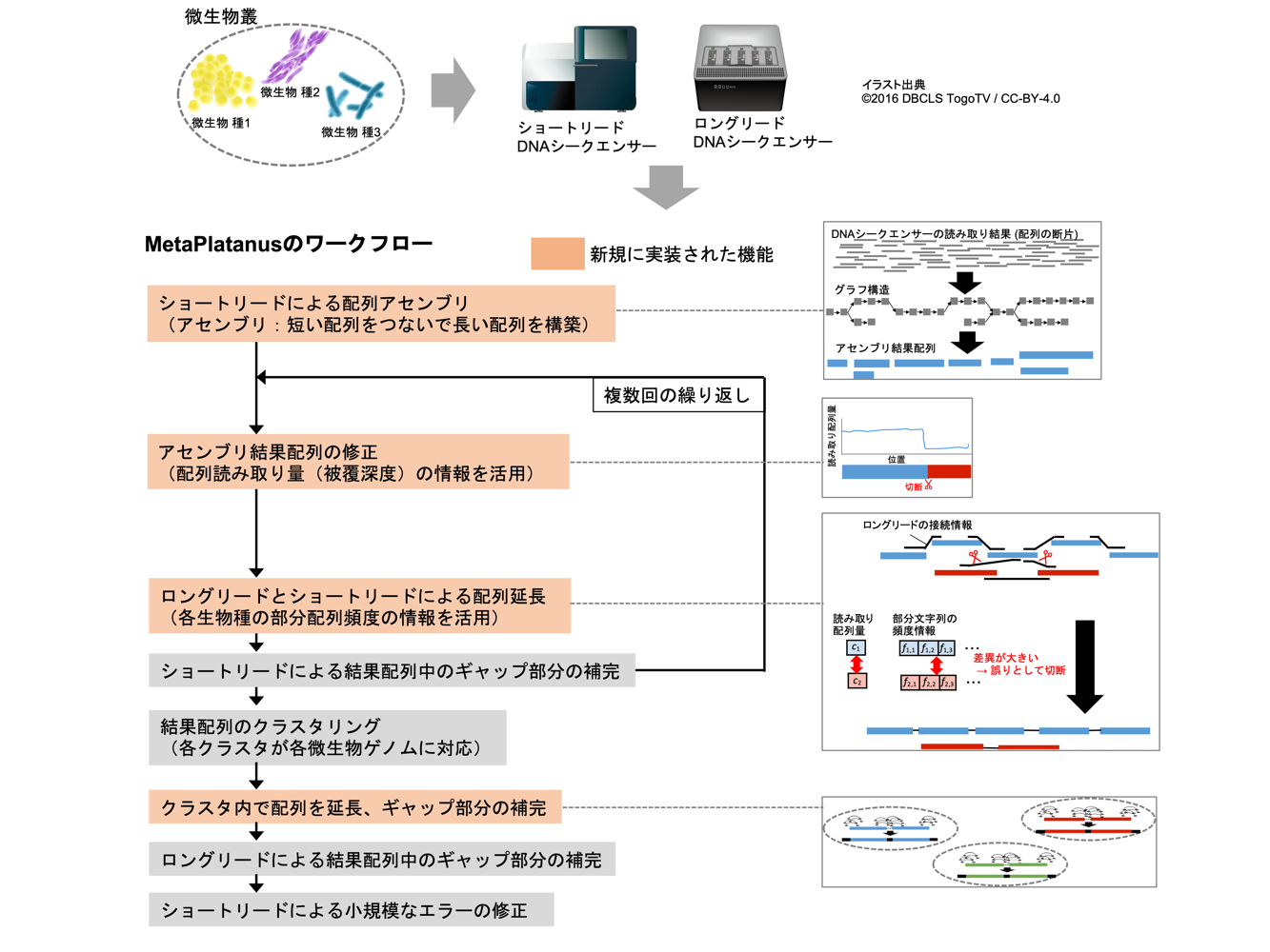 微生物叢中のゲノムの新規配列決定を行う情報解析手法を開発した。本研究で開発されたソフトウェアである「MetaPlatan...