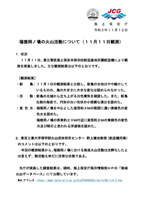 福徳岡ノ場の火山活動について(11月11日観測)