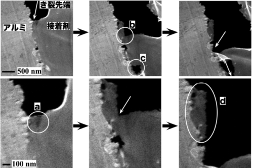 電子顕微鏡下で接着剤の剥離過程をリアルタイムで直接観察することに成功した。破壊に至るまでに接着剤の極微小な変形が複雑に進...
