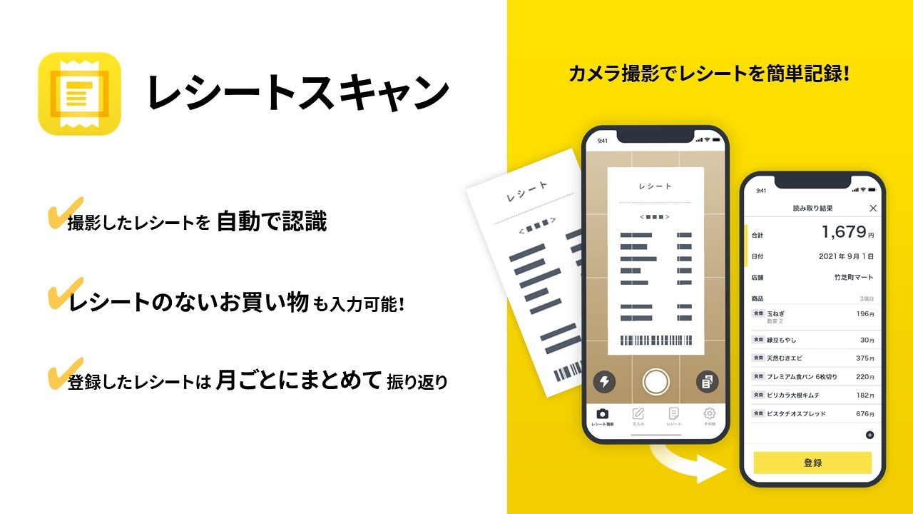 アプリを使用して紙のレシートを撮影すると、自動的に文字情報がデータ化され、店舗名・購入した商品名や金額などを認識し登録す...